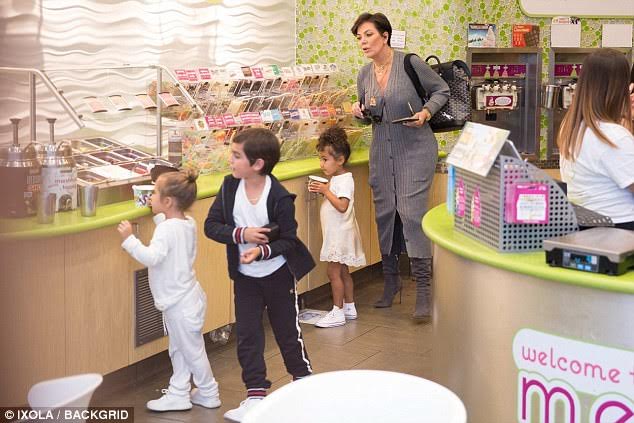 Kris, who raised six children and now has six grandchildren, treated her three oldest grandkids to a movie, dinner and then frozen yoghurt from Menchies. North West and Penelope Disick coordinated in white outfits and white footwear while Mason Disick wore a combination of black and white.