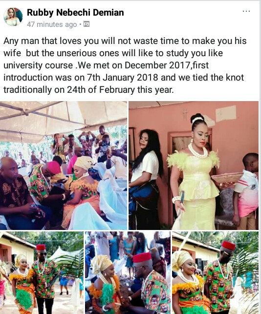 “Any man that loves you will not waste time to make you his wife but the unserious ones will like to study you like university course .We met on December 2017,first introduction was on 7th January 2018 and we tied the knot traditionally on 24th of February this year.”